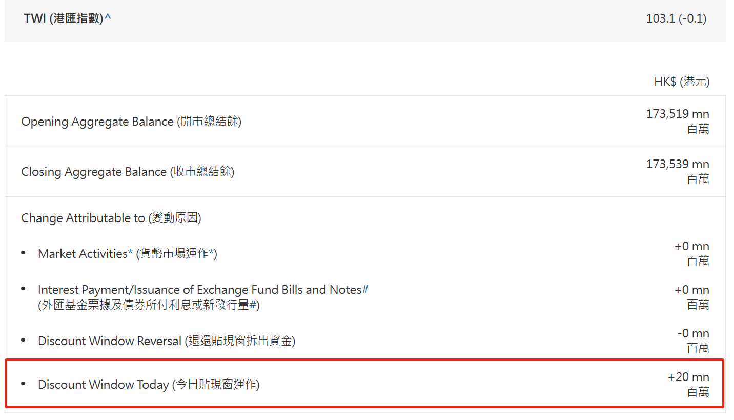 香港金管局通过贴现窗口向银行投放2000万港元流动性