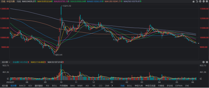 今日(6月9日),白酒板块表现依旧不佳,截至收盘,总市值居前的“茅、五、山、泸”均有不同程度下跌。若以指数层面统计,中证白酒指数今日跌近0.72%,盘中一度跌至9382.11点,不仅续刷年内最低点,同时创去年9月26日以来新低。