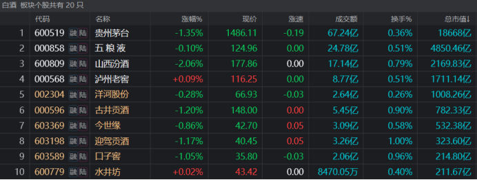 注:总市值居前的白酒股今日仍跌多涨少(截至6月9日收盘)