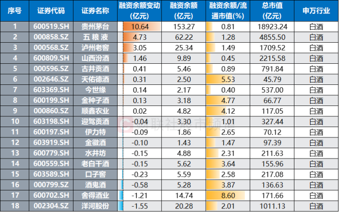 注:白酒板块近期融资余额变动情况(截至6月6日数据)