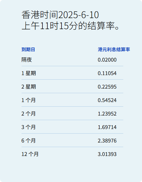 智通财经APP获悉,港元拆息持续偏软,一个月及以上拆息全线走低。其中,与楼按相关的一个月拆息连跌六天,报0.54524%,续创2022年6月15日后新低。隔夜息维持0.02%。一、两周拆息齐升,但六个月及一年期拆息分别降至2.38976%和3.01393%。