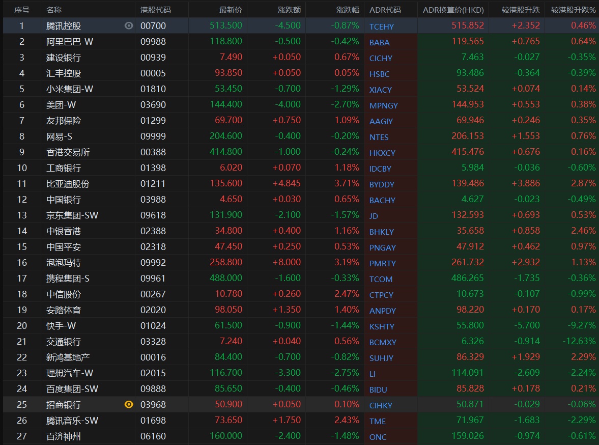 智通财经APP获悉,周二美股三大股指集体上涨,恒生指数ADR上涨,按比例计算,收报24177.5点,较香港收市涨14.63点或0.06%。