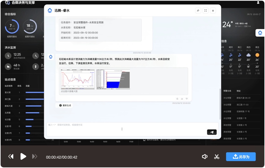 洪水预警与应急响应:通过洪水演进模拟模型,AI智能体理解管理人员对突发水灾风险评估和应对方案的需求,融合实时水文数据与地形信息,提供精准预警与科学决策支持。