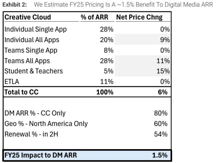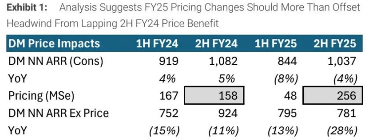 大摩对上个月宣布的价格变动的最新分析表明,2025财年数字媒体ARR将增加约 15 个百分点。尽管公司确认最新的价格变动已包含在 2025财年的预期中,大摩预计下半年数字媒体业务ARR将有适度增长,原因在于:1)分析表明,近期价格变动带来的推动力(2025 年下半年约 2.56 亿美元)要大于前期价格变动带来的阻力(2024 年下半年约 1.58 亿美元);2)预期指引显示下半年数字媒体的 ARR 增长将放缓,且下半年NNARR 将同比下降。展望未来,价格变动在 2026 年应会进一步带来益处,因为 1 月的续约业务将得到确认,且价格变动可能会扩展至北美以外地区(平均每个地区约增加 1.5 个百分点的增长)——而这一点并未在华尔街对 2026 年数字媒体 ARR 增长的预测中考虑到,该预测进一步将 2026 年的 ARR 增长预期放缓至同比 10%。