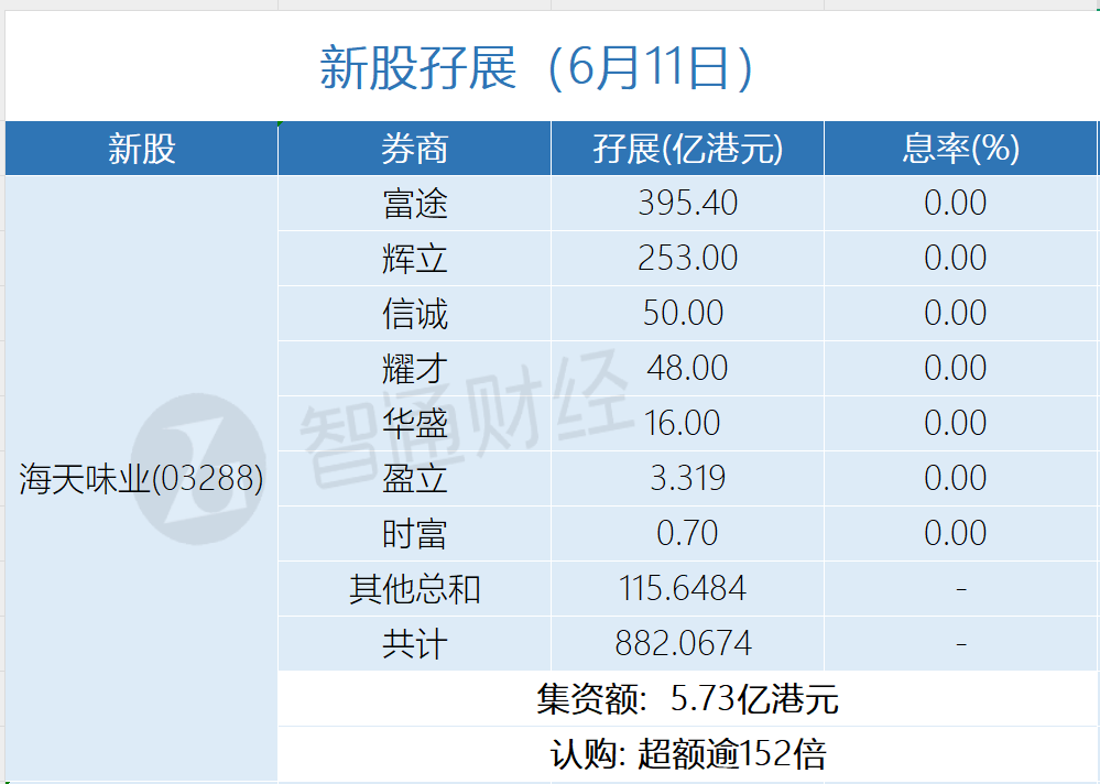 智通财经APP获悉,海天味业(03288)正在招股中。截止6月11日,富途、辉立、耀才等券商合计为海天味业借出882.0674亿港元,超购逾152倍。