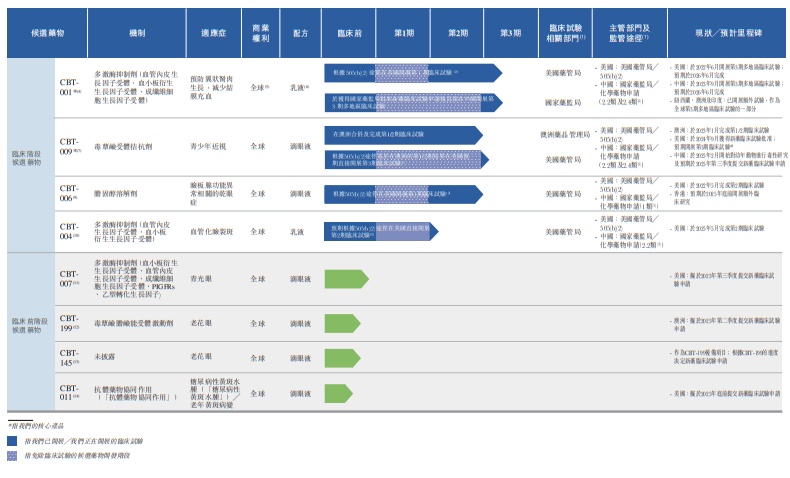 除四款临床阶段候选药物外,拨康视云的管线亦包括四款临床前阶段候选药物,即 CBT-007(用于提高青光眼滤过手术的成功率)、CBT-199及CBT-145(分别为适用于治疗老花眼的新制剂及新化学实体)及CBT-011(一种适用于治疗糖尿病性黄斑水肿(“糖尿病性黄斑水肿”的ADS共轭物),糖尿病性黄斑水肿是视网膜内液积聚引起的视网膜增厚症)。