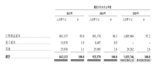 拆解颖通控股的销售成本可以发现,公司已售商品成本,由2023财年的8.01亿元,增长至2025财年的10.06亿元,年复合增长率约为12.05%,高于收入增长速度。招股书显示,颖通控股的已售商品成本,主要包括采购公司所销售产品的成本及相关关税。