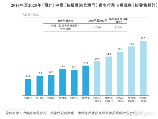 从行业前景看,中国香水市场正处于高速增长期。根据弗若斯特沙利文报告,中国香水零售额从2018年的146亿元增至2023年的261亿元,复合年增长率约12.3%,预计2028年将达477亿元,2023-2028年复合年增长率约12.8%。2023年中国内地人均香水支出为16元,低于2023年日本、韩国、美国及英国,分别为47元、170元、423元及406元。