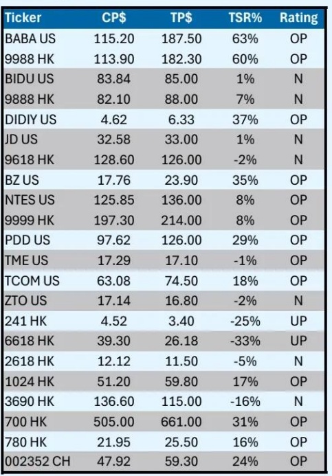 该行重申对具备强大生态系统企业的乐观看法,这类企业能够覆盖更广泛的垂直领域并提升用户时长。通过将 AI 集成到现有内容循环并重构工作流,该行已观察到一系列改进 —— 包括推荐算法、广告工具、内容生成等 —— 这些均推动了消费者、企业和开发者的采用率提升。值得关注的是,头部互联网巨头已制定清晰的 AI 战略:腾讯聚焦智能体 AI / 应用层,阿里巴巴侧重云 + AI 基础设施。该行认为这种差异化将有助于减少同质化竞争,并推动行业多年的增长与创新。