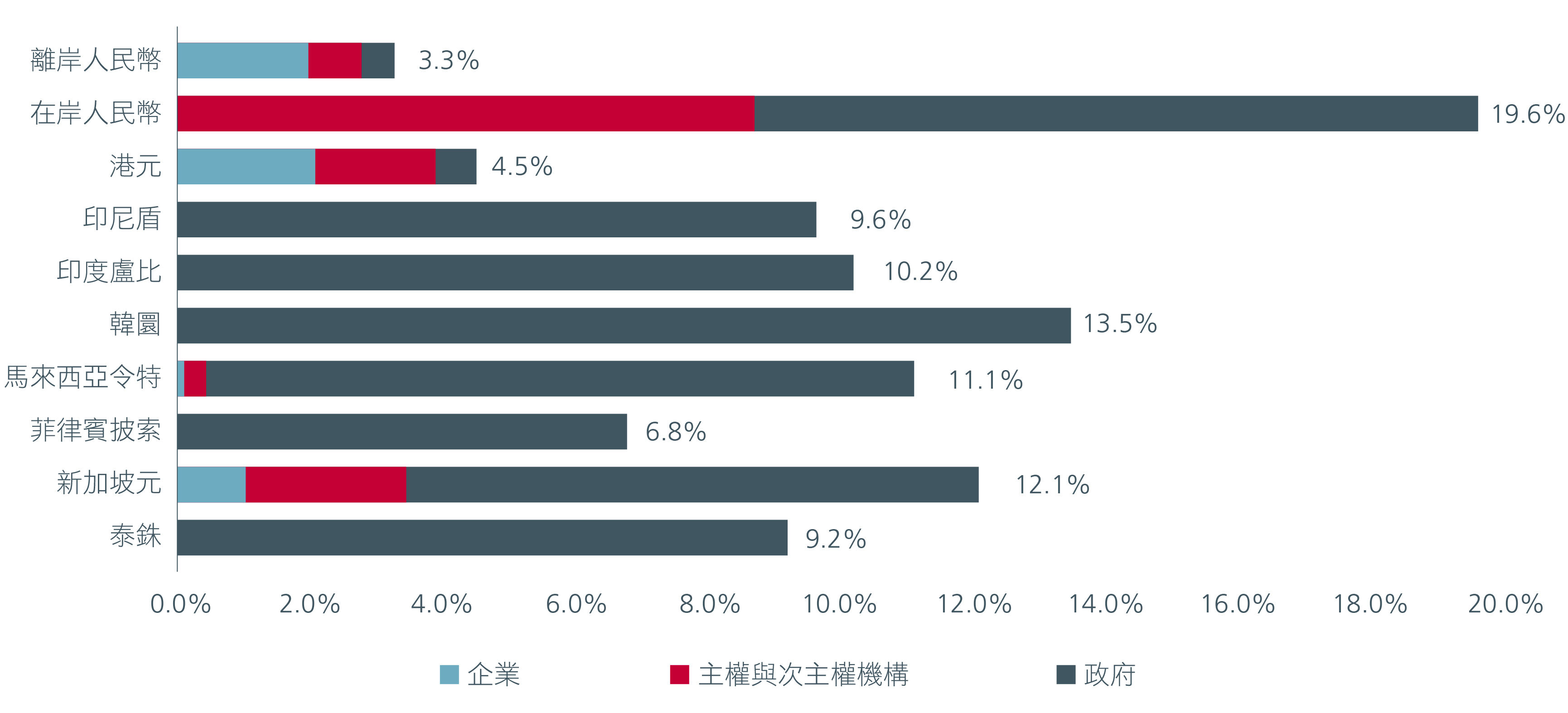 亚洲主权机构是当地货币债券指数的主要发行人。多个亚洲政府债券市场均拥有投资级别评级,有望为投资者提供兼具质量债券及回报的选项。中国、马来西亚、新加坡及泰国的企业发行人相对活跃。
