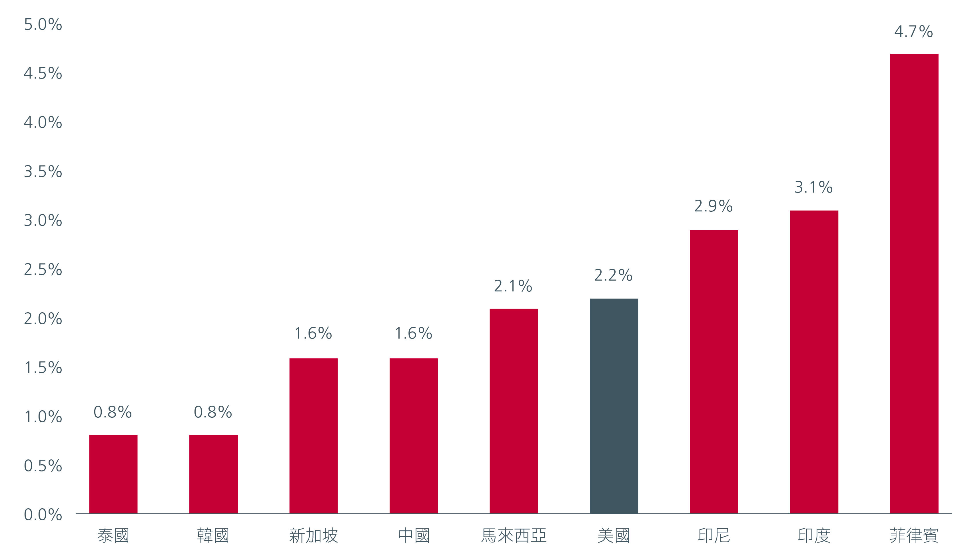 由于通胀受控及名义收益率仍然偏高,亚洲的实际收益率在全球市场名列前茅。例如,印尼、印度及菲律宾的实际收益率目前均高于美国。