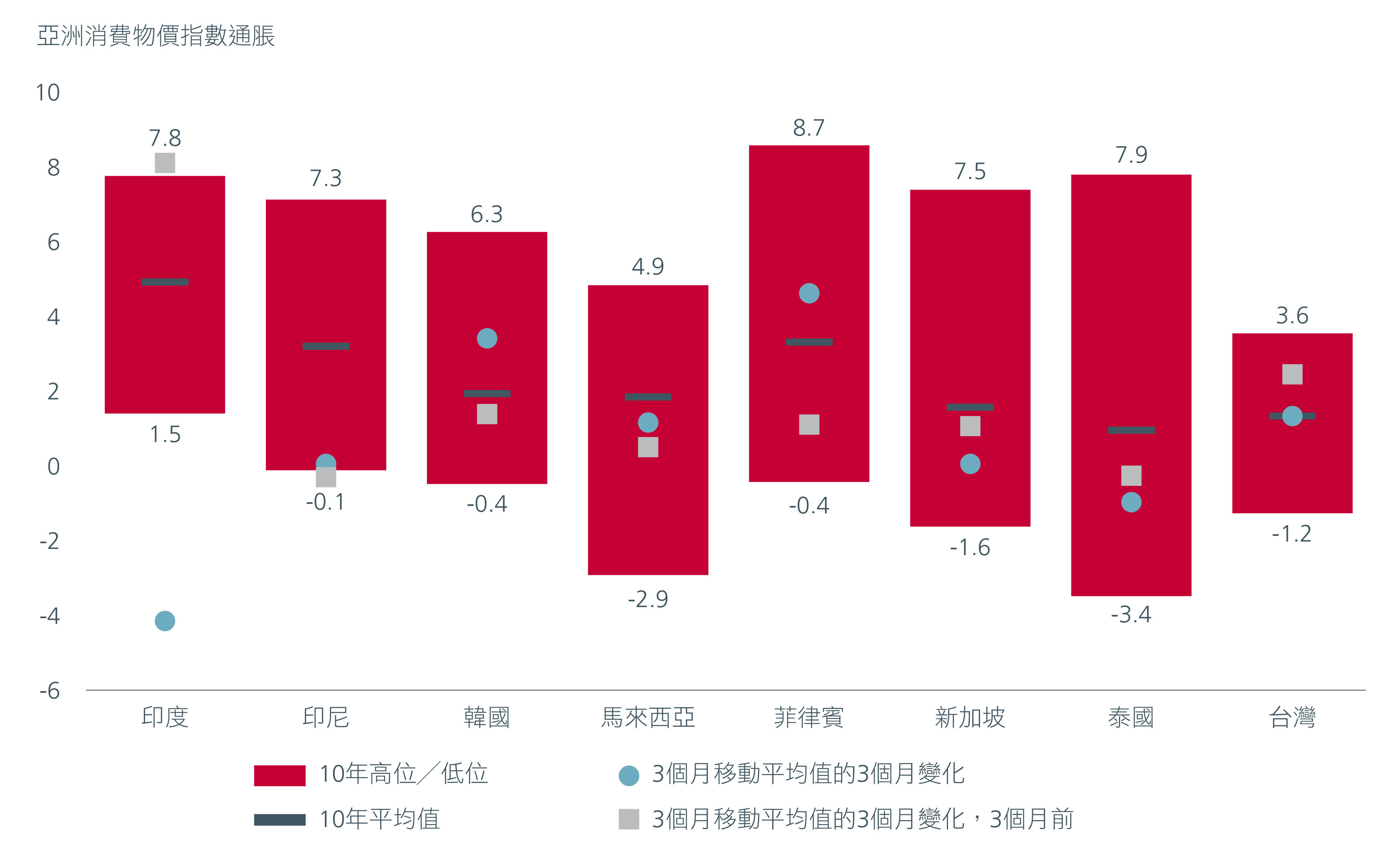 虽然美国及欧洲部分地区的通胀仍然高企,但亚洲的情况却有所不同。亚洲央行大致已有效控制通胀预期。以印度为例,在食品价格下跌的带动下,通胀已回落至按年3.2%的六年低位。菲律宾亦录得温和通胀,其国内需求疲弱使央行得以维持鸽派立场。