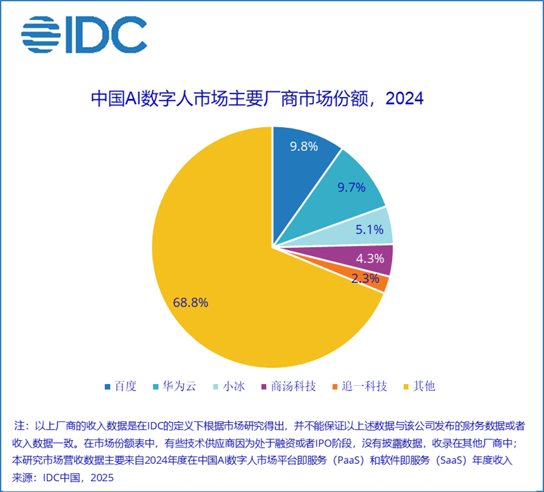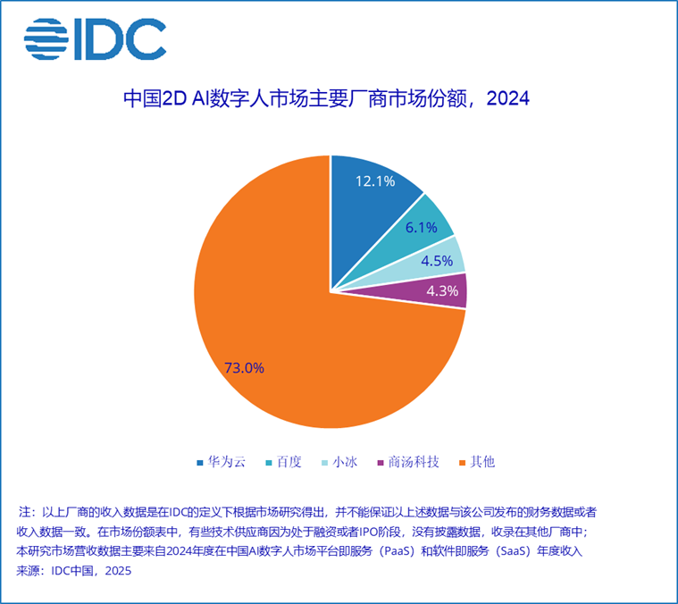 由于当前市场2D数字人赛道落地迅速,本次研究报告也单独切分了2D数字人市场份额——2024 年市场规模达28.9 亿元人民币,相比 2023 年增长 101.2%。该细分市场的主要玩家包括华为云、百度、小冰、商汤科技等。