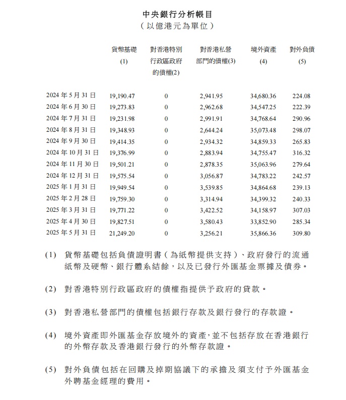 智通财经APP获悉,6月13日,香港金融管理局公布外汇基金在2025年5月底的主要分析账目。在5月份,外汇基金的境外资产增加2013亿港元,至35866亿港元。货币基础为21249亿港元,包括负债证明书、政府发行的流通纸币及硬币、银行体系结余,以及已发行外汇基金票据及债券。外汇基金对香港私营部门的债权总额为3256亿港元。对外负债总额为310亿港元。