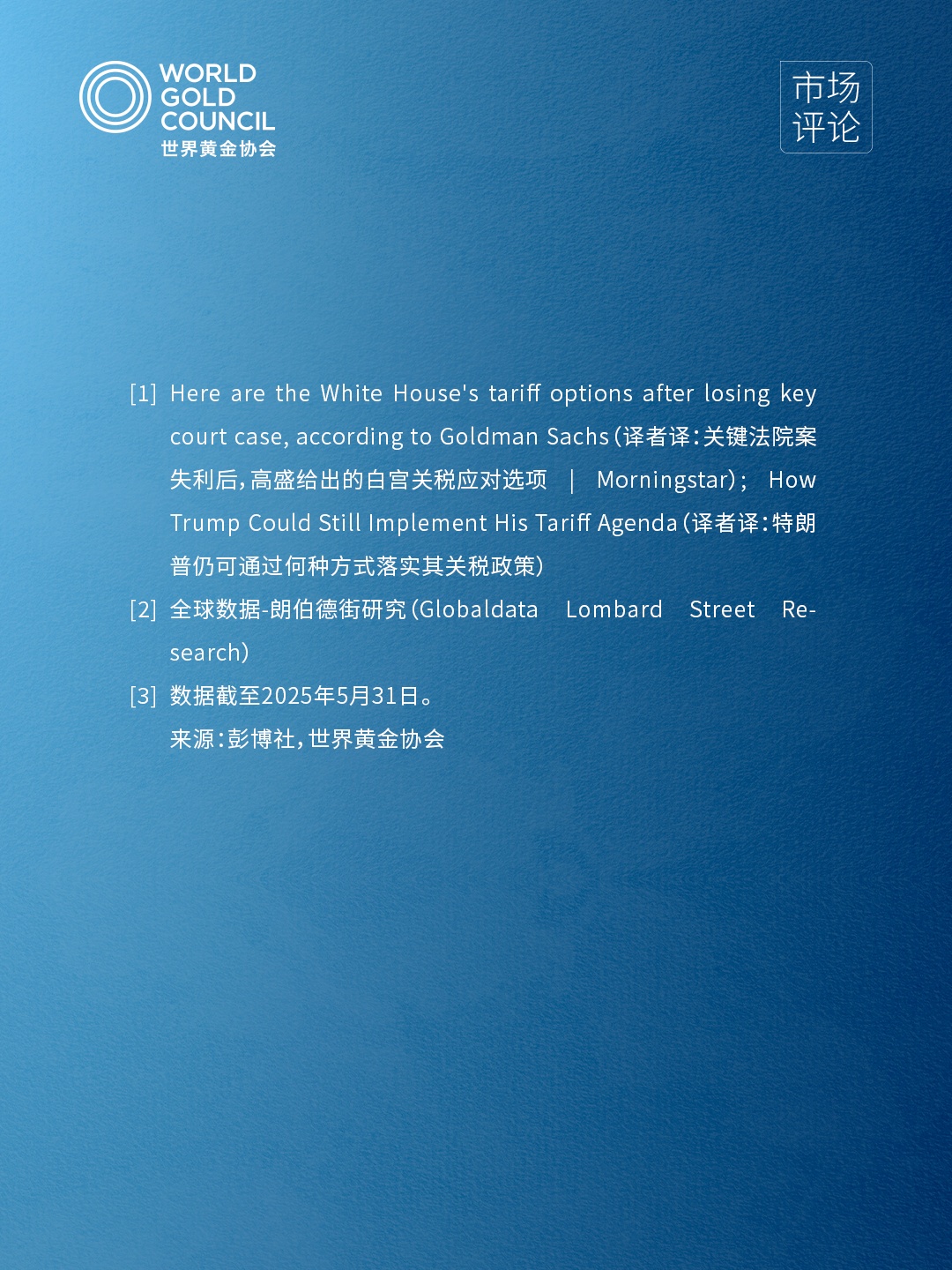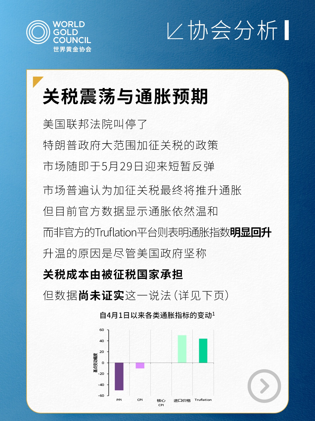 世界黄金协会提到,美国联邦法院叫停了特朗普政府大范围加征关税的政策,市场随即于5月29日迎来短暂反弹,市场普遍认为加征关税最终将推升通胀,但目前官方数据显示通胀依然温和,而非官方的Truflation平台则表明通胀指数明显回升,升温的原因是尽管美国政府坚称关税成本由被征税国家承担但数据尚未证实这一说法。