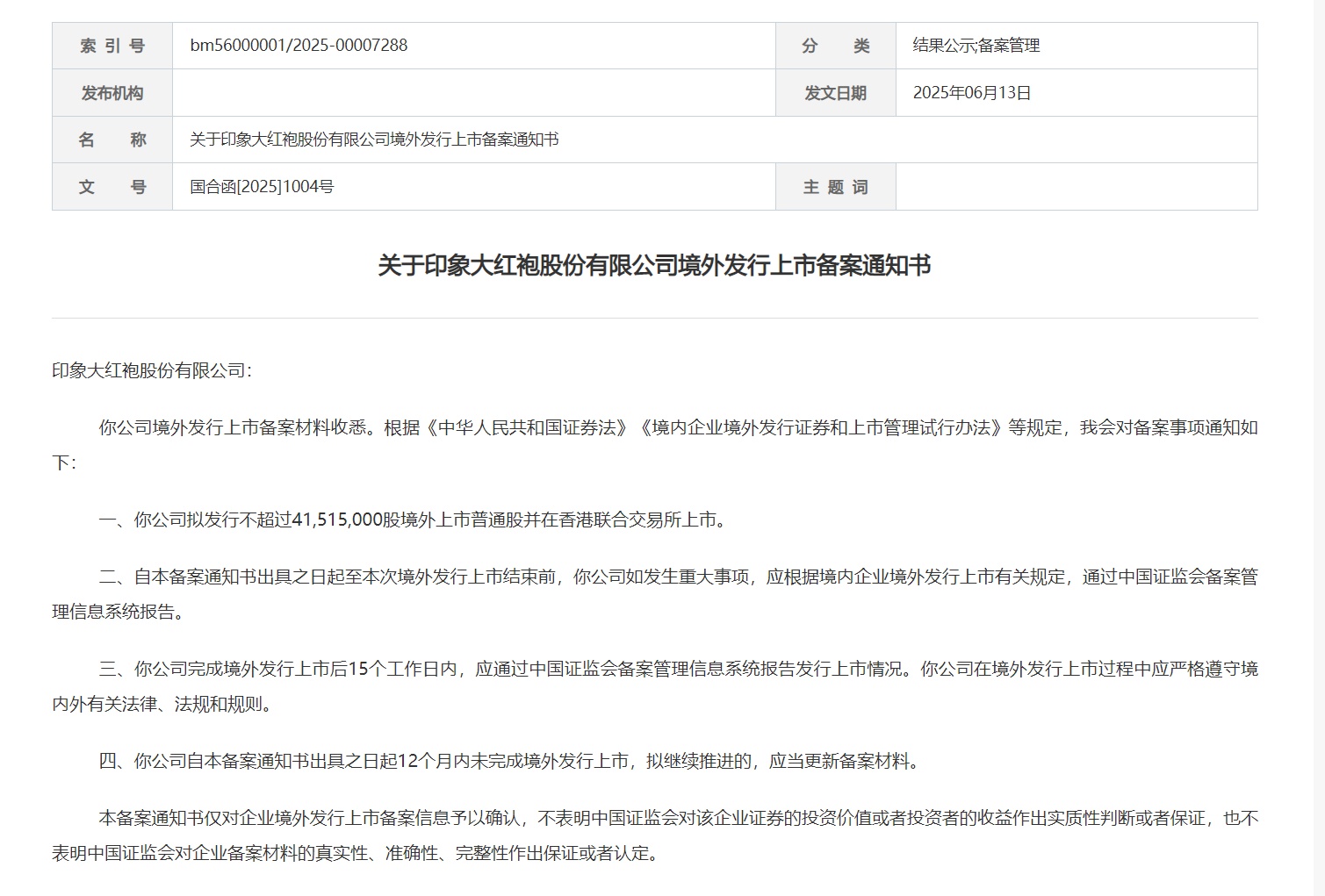 智通财经APP获悉,6月13日,中国证监会国际合作司发布《关于印象大红袍股份有限公司境外发行上市备案通知书》。公司拟发行不超过41,515,000股境外上市普通股并在香港联合交易所上市。