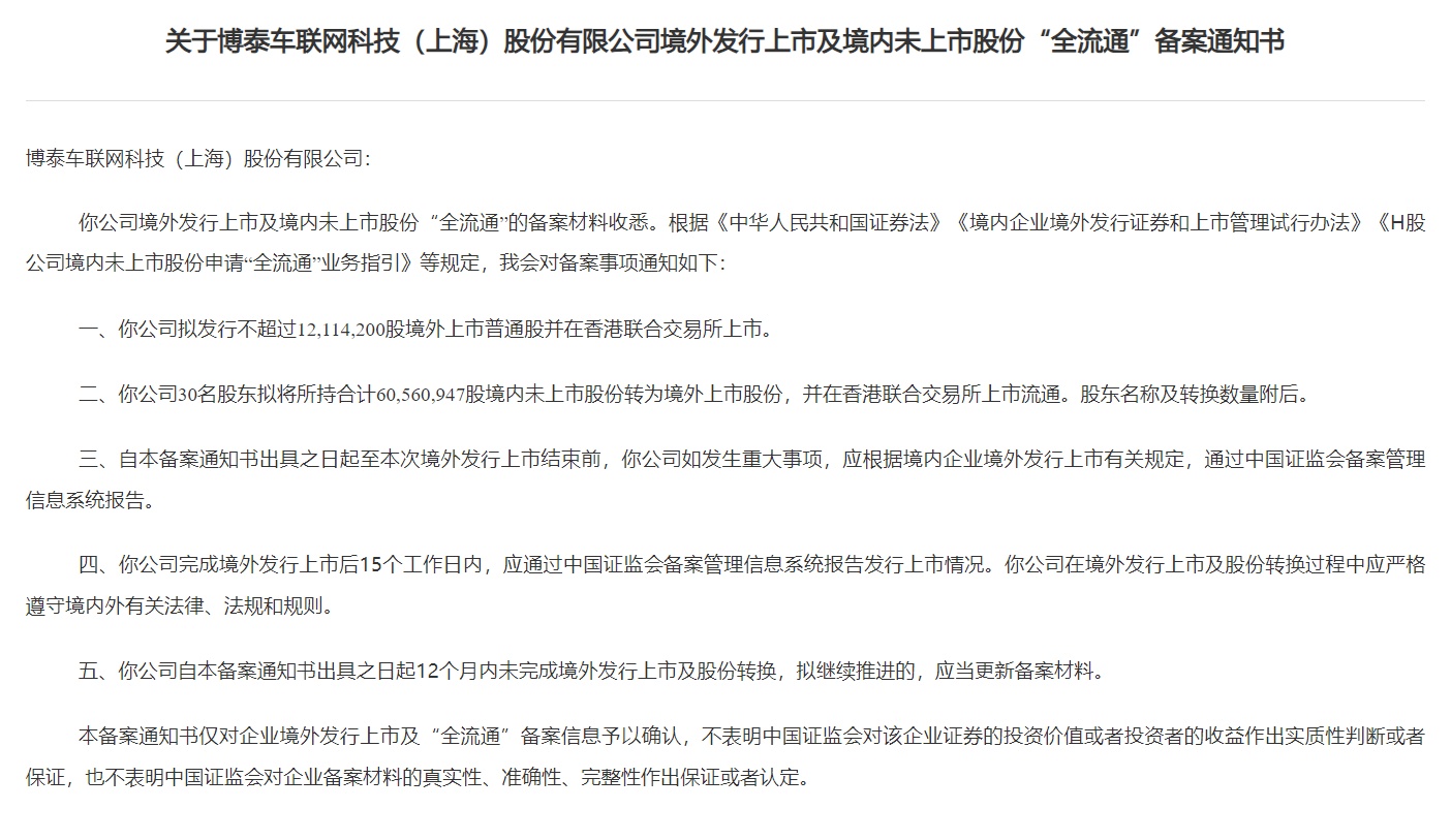 智通财经APP获悉,6月13日,中国证监会国际合作司发布《关于博泰车联网科技(上海)股份有限公司境外发行上市及境内未上市股份“全流通”备案通知书》。公司拟发行不超过12114200股境外上市普通股并在香港联合交易所上市。此外,公司30名股东拟将所持合计60560947股境内未上市股份转为境外上市股份,并在香港联合交易所上市流通。