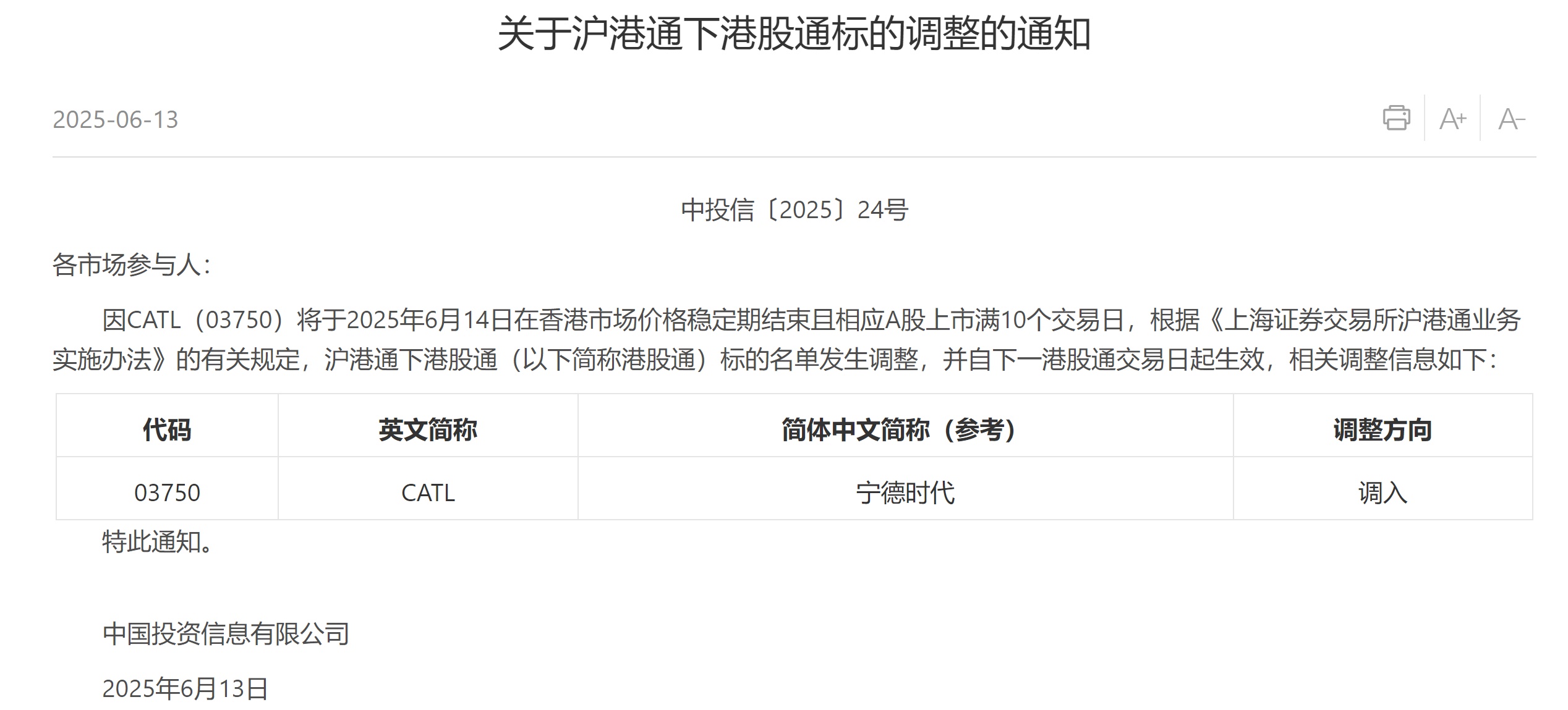 智通财经APP获悉,6月13日,上交所发布公告称,根据《上海证券交易所沪港通业务实施办法》的有关规定,沪港通下港股通(以下简称港股通)标的名单发生调整,宁德时代(03750)调入港股通股票名单,并自下一港股通交易日起生效。