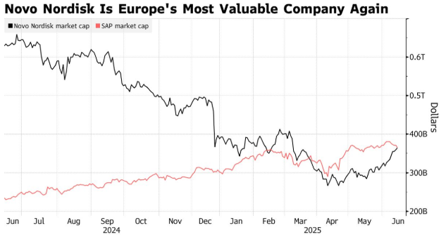 智通财经APP获悉,周五,诺和诺德(NVO.US)市值超过软件开发商SAP(SAP.US),重新夺回欧洲上市公司市值冠军的宝座。截至发稿,诺和诺德的市值为 3650 亿美元,而SAP市值为 3643 亿美元。