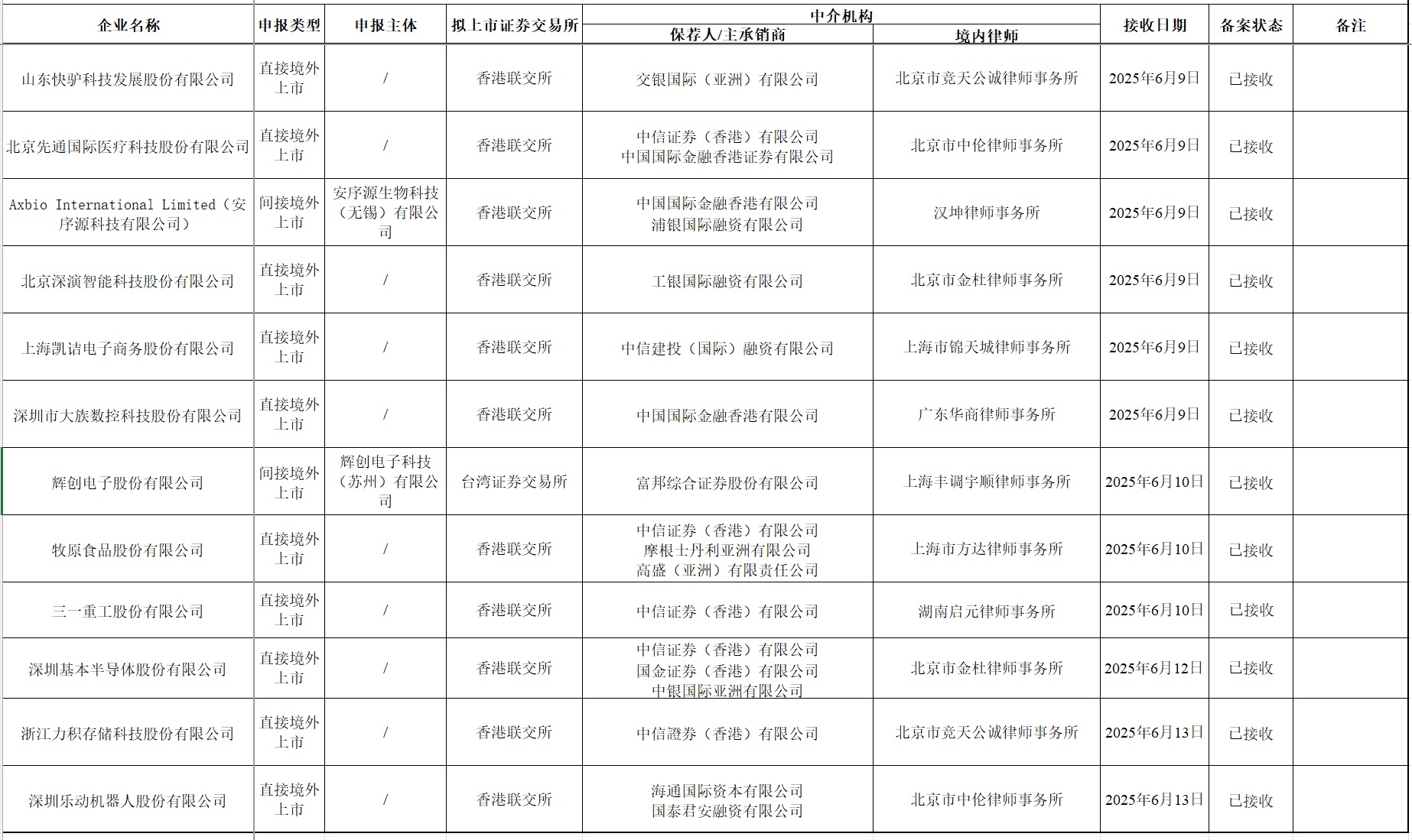 智通财经APP获悉,6月13日,中国证监会发布境内企业境外发行证券和上市备案情况表(首次公开发行及全流通)(截至2025年6月13日)。本周(6月9日-13日),新增快驴科技、先通医药、深演智能、凯诘电商、大族数控(301200.SZ)、牧原股份(002714.SZ)、三一重工(600031.SH)、基本半导体、力积存储等公司拟香港IPO获中国证监会接收材料。
