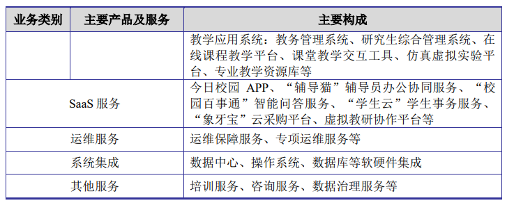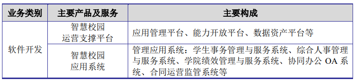 招股书显示,金智教育是国内领先的高校信息化服务提供商,以自主研发的基于私有云和公有云架构的智慧校园运营支撑平台产品、应用系统产品为基础,为高等院校和中职学校提供软件开发、SaaS 服务、运维服务、系统集成等信息化服务。