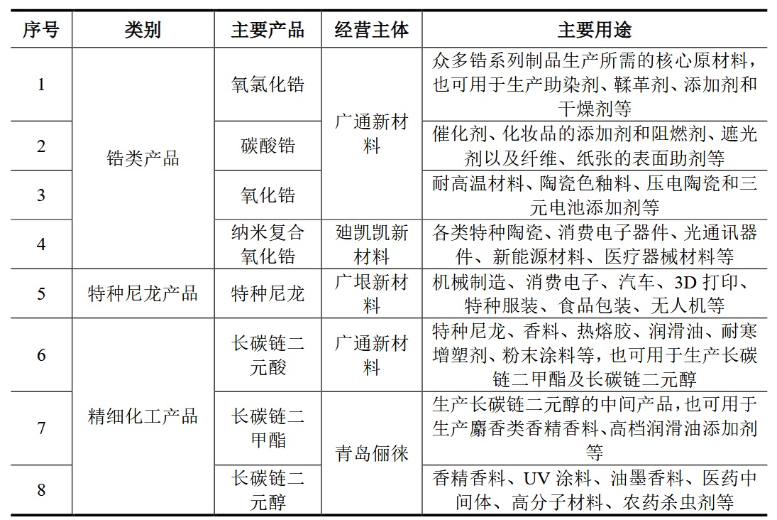 招股书显示,长裕集团主要从事锆类产品、特种尼龙产品、精细化工产品的研发、生产和销售,主要产品包括氧氯化锆、碳酸锆、氧化锆、纳米复合氧化锆、特种尼龙、长碳链二元酸、长碳链二元醇及长碳链二甲酯等。公司系行业知名的锆类产品及特种尼龙产品供应商,氧氯化锆产能规模全球最大,特种尼龙产能规模及品种丰富度国内领先。