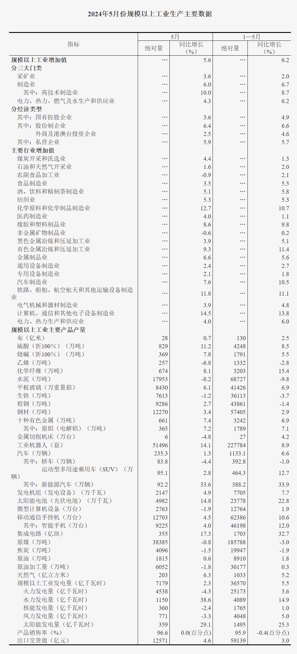分产品看,5月份,规模以上工业623种产品中有326种产品产量同比增长。其中,钢材12743万吨,同比增长3.4%;水泥16500万吨,下降8.1%;十种有色金属683万吨,增长2.9%;乙烯303万吨,增长14.4%;汽车264.2万辆,增长11.3%,其中新能源汽车124.5万辆,增长31.7%;发电量7378亿千瓦时,增长0.5%;原油加工量5911万吨,下降1.8%。