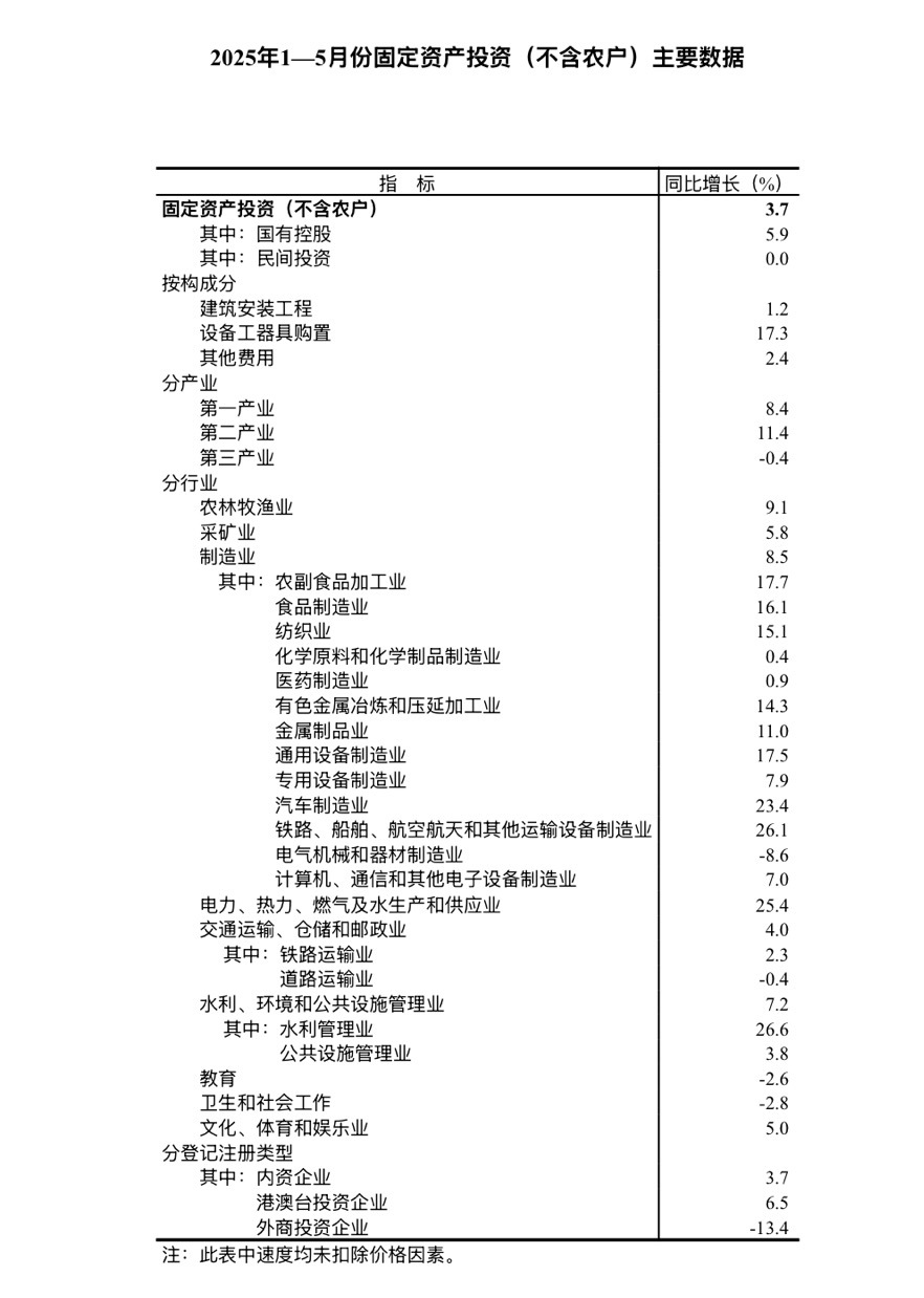 智通财经APP获悉,6月16日,据国家统计局消息,2025年1—5月份,全国固定资产投资(不含农户)191947亿元,同比增长3.7%(按可比口径计算)。其中,民间固定资产投资同比持平。从环比看,5月份固定资产投资(不含农户)增长0.05%。