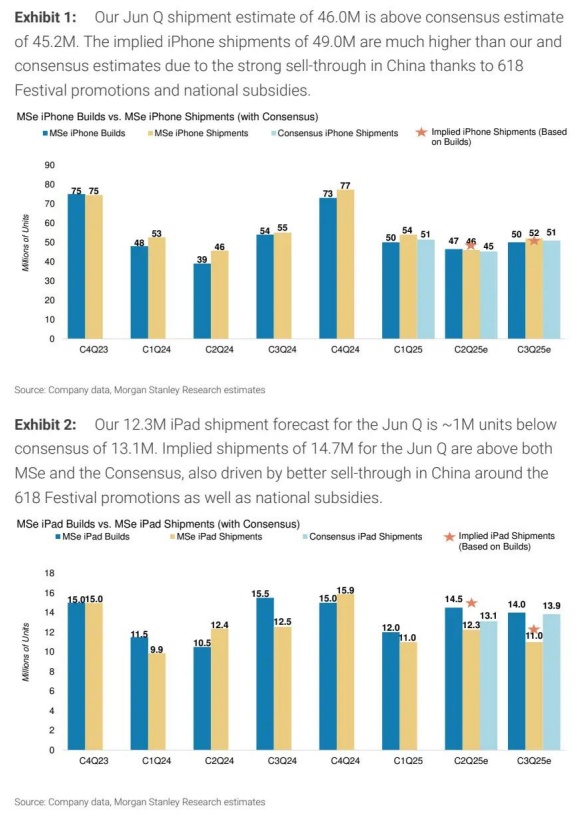 但目前的产量预测显示,三季度iPhone出货量与摩根士丹利当前2000万部的预测一致,iPad产量比其1300万部的预测高出100万部。因此,尽管三季度季节性表现疲软,但基于二季度的强劲基数,生产和出货量实际上表明,三季度的出货量仍将符合或略高于该行预期。
