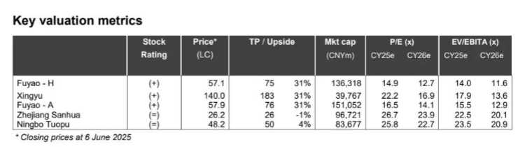 鉴于福耀玻璃盈利增长势头稳定,该行采用目标市盈率估值法对其进行估值。通过将20倍的目标市盈率应用于2025年/2026年预期平均每股收益(EPS),得出福耀玻璃-A股的目标价为76元人民币。将18倍的目标市盈率应用于2025年/2026年预期平均每股收益(EPS),从而得出福耀玻璃-H股的目标价为75港元。