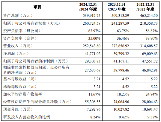 财务方面,于2022年度、2023年度、2024年度,宏明电子实现营业收入分别约为31.46亿元、27.27亿元、25.25亿元人民币;同期,净利润分别约为6.9亿元、5.98亿元、4.18亿元人民币。