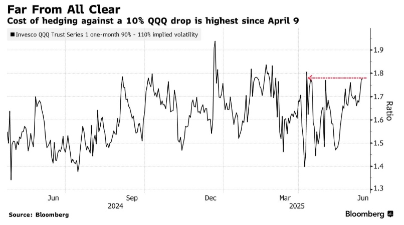 统计数据显示,在上周五交易时间段,针对该ETF “下跌10%”保护性质看跌期权的隐含波动率溢价(相较于“上涨10%”的看涨期权)指标升至4月初以来最高,凸显市场对科技股剧烈回调风险的高度警惕。