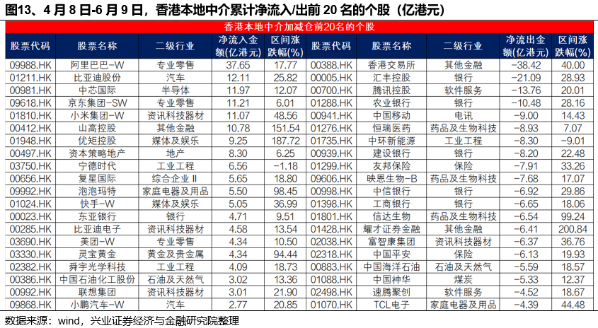 香港本地中介同样以加仓阿里巴巴等科技股并减仓金融行业为主。4月8日-6月9日期间,香港本地中介主要加仓阿里巴巴-W(09988)、比亚迪股份(01211)、中芯国际(00981)、京东集团-SW(09618)和小米集团-W(01810),而净流出较多的标的包括香港交易所(00388)、汇丰控股(00005)、腾讯控股(00700)、农业银行(01288)和中国移动(00941)。