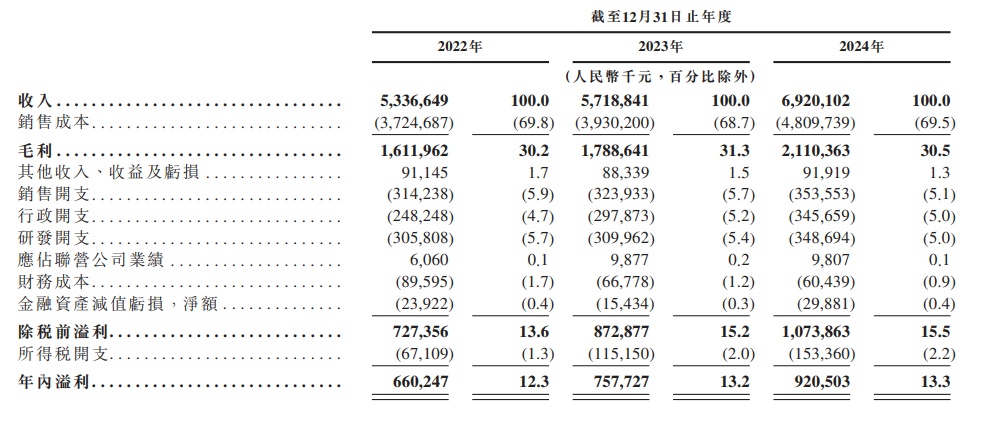 业绩方面,于2022年度、2023年度、2024年度,沃尔核材实现收入分别约为53.37亿元、57.19亿元、69.20亿元人民币;同期,年内溢利分别为6.60亿元、7.58亿元、9.21亿元人民币。