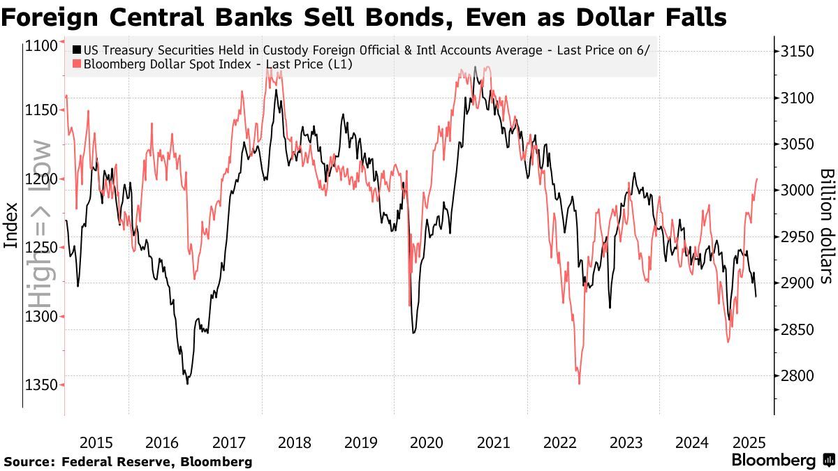 近几个月来,国际投资者对美国国债的兴趣日益受到关注。美国总统特朗普的贸易和财政政策扰乱了金融市场,并引发市场对海外买家可能会回避美国资产的猜测,也就是所谓的“抛售美国交易”。彭博美元现货指数在2025年已下跌约8%,目前接近三年来低点,部分原因是市场担忧关税会削弱美国经济前景。