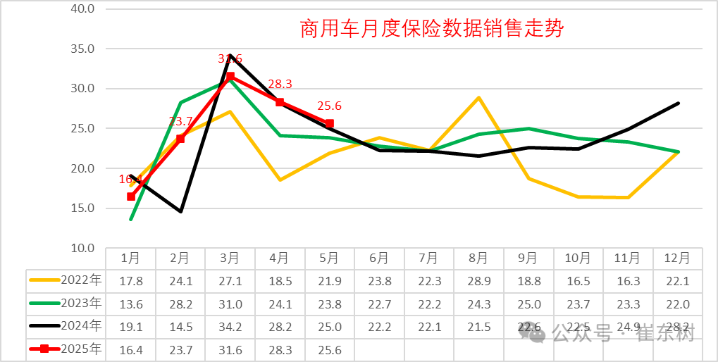 2025年商用车车市呈现1月的春节前置带来的2-5月的持续走强的走势特征。由于春节较早,车市节后启动也较早。今年1月商用车月度数据环比下降较大,2月商用车销量23.7万台,属于历年的销量中位。3月商用车销量达到31.6万台,实现持续拉升的良好走势。4月商用车销量达到28.3万台,环比降速较慢,5月商用车销量达到25.6万台,环比创出当月的近期历史新高。