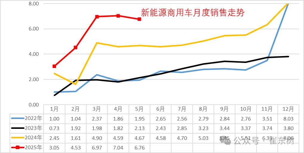 2025年新能源商用车整体呈现快速拉升的良好局面。3-5月持续高位,新能源增长较强。2025年5月的新能源销量迅速达到6.8万台的高位,说明新能源的需求旺盛。