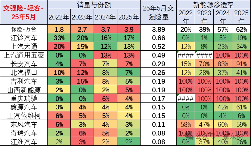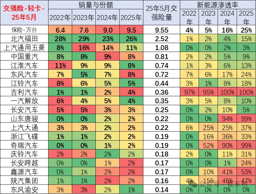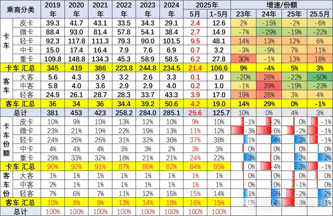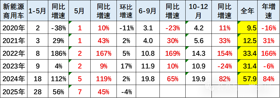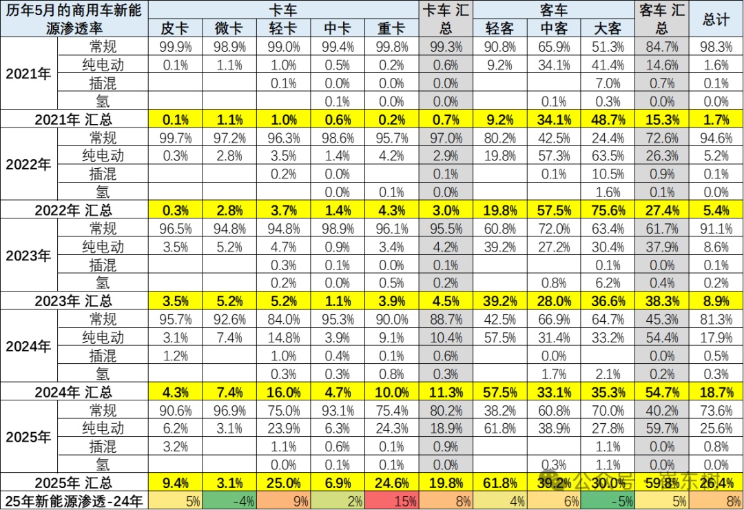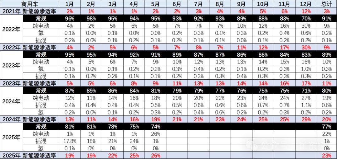 从2019-2021年,整个新能源商用车的渗透率在3%左右水平,2022年达到9%,2023年达到11%,2024年全年达到20%,2025年1-5月就达到渗透率23%的良好水平,体现了新能源商用车强势增长良好态势。