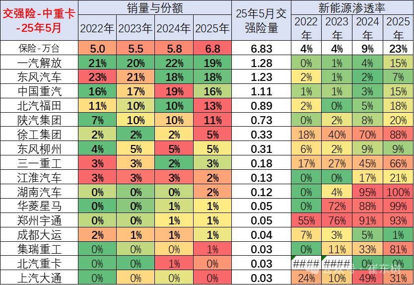 国内市场中重卡市场表现最为优秀的应该是一汽解放、东风汽车、中国重汽等企业,重卡总体表现相对平稳,徐工等部分重卡二线车企电动车渗透率提升。去年解放的年末冲刺力度很强,而且新能源较多,今年5月燃油车暂时较低。