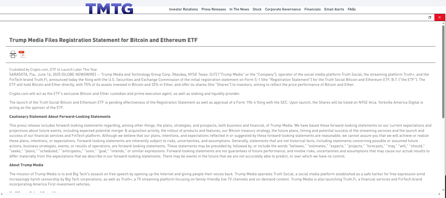 特朗普媒体科技集团周一表示,该公司计划推出一支交易所交易基金(ETF),同时投资比特币和以太币。该公司已经向美国证券交易委员会提交了相关申请,这也是该公司在不到两周内提交的第二份加密货币ETF申请。