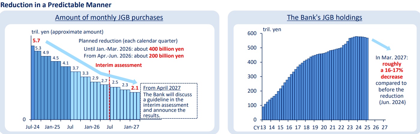 日本央行放缓了其每月债券购买规模的缩减速度,从2026年4月起,将月度减持规模从目前的每季度4000亿日元降至每季度2000亿日元;预计2027年1月至3月的购买总额将约为2万亿日元。分析指出,这大致相当于该行在2013年实行超宽松货币政策之前的购债水平。