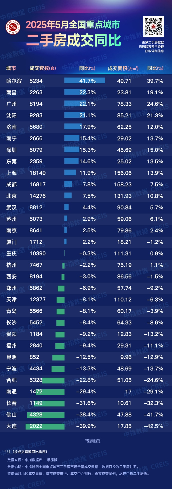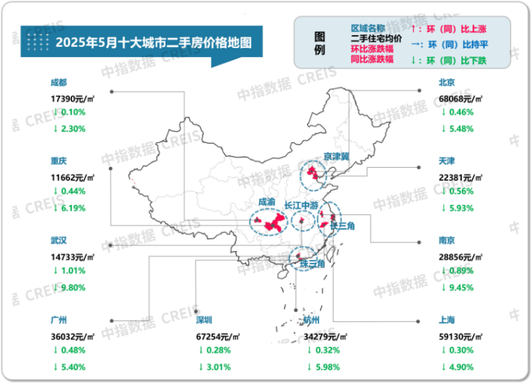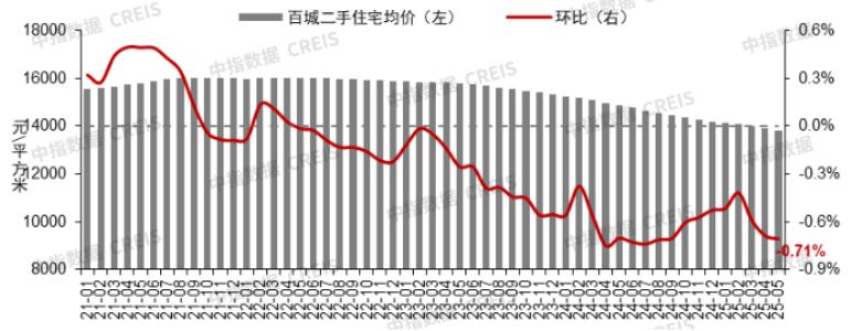 根据中国房地产指数系统百城价格指数,2025年5月,百城二手住宅均价环比下跌0.71%,同比下跌7.24%;十大城市二手住宅均价环比下跌0.43%,同比下跌5.39%,同比跌幅收窄0.3个百分点。