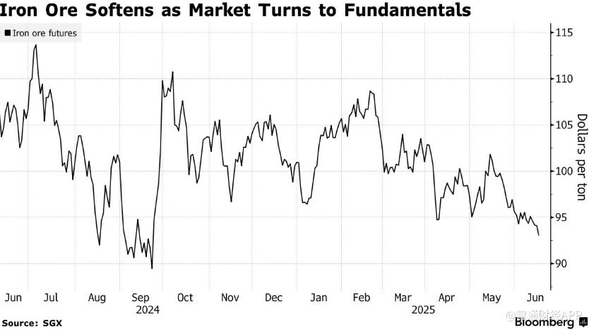 周二,新加坡铁矿石期货一度下跌1.2%,至每吨92.90美元。中国钢铁期货也出现下跌。