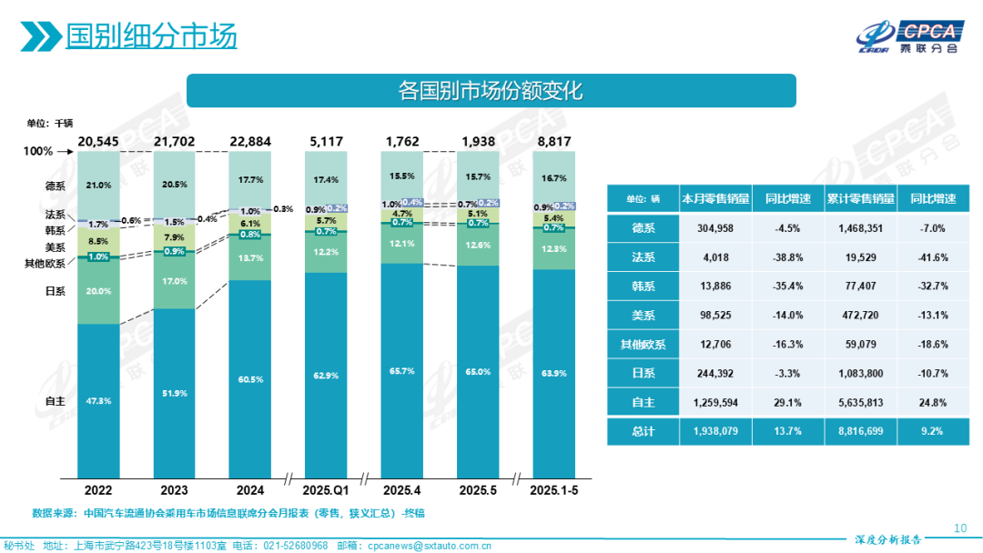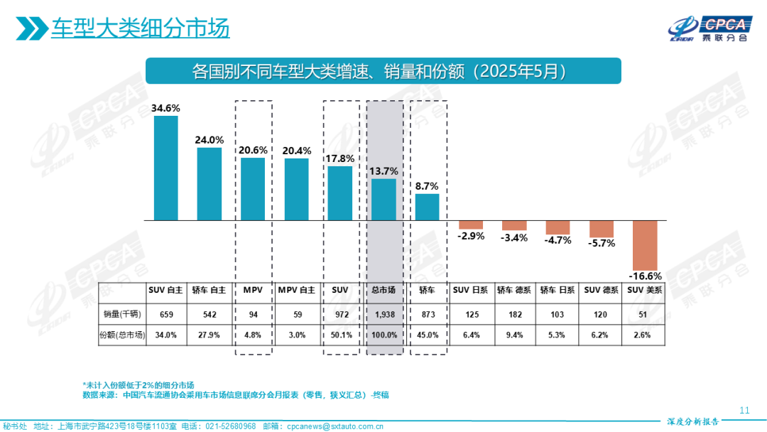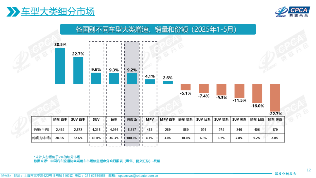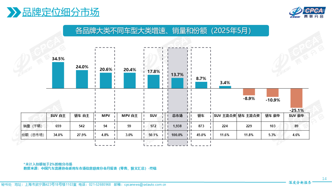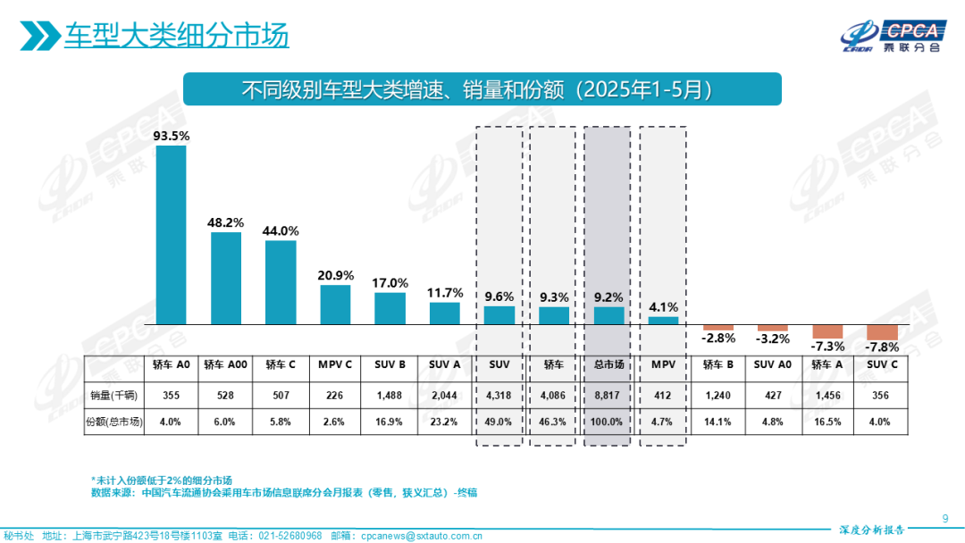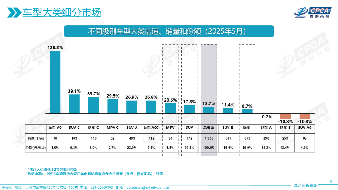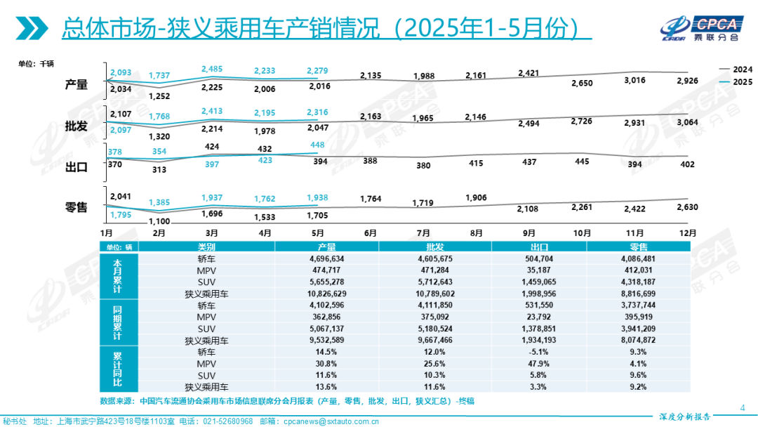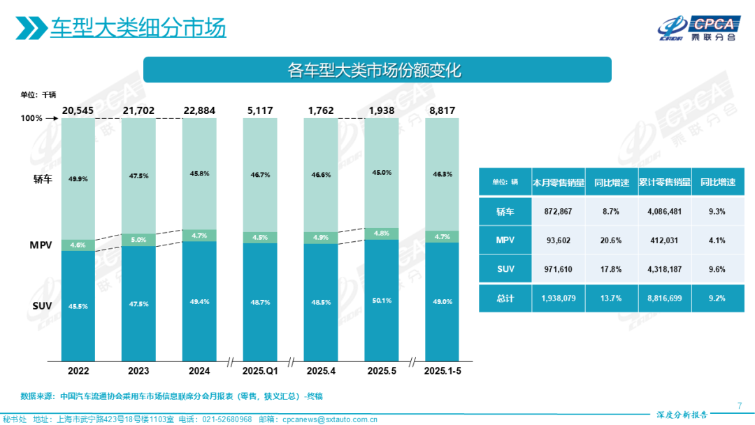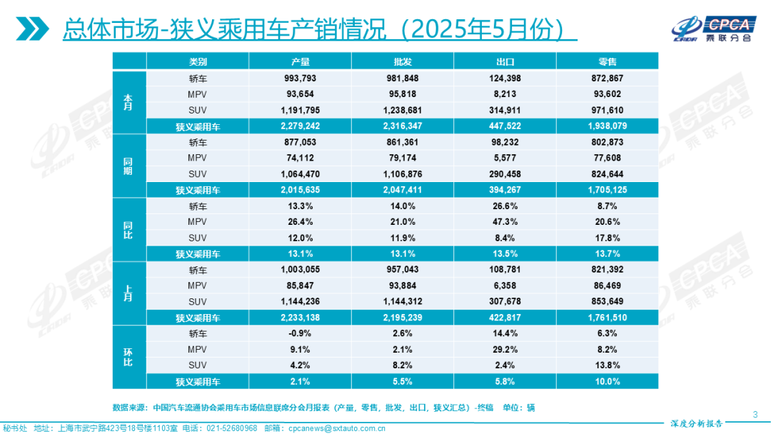 智通财经APP获悉,6月17日,乘联分会发布2025年5月份全国乘用车市场深度分析报告。数据显示,2025年5月我国狭义乘用车零售量约193.8万辆,同比增长13.7%,环比增长10%。其中,5月轿车市场零售量87.3万辆,同比增长8.7%,环比增长6.3%;SUV市场零售量97.2万辆,同比增长17.8%,环比增长13.8%;MPV市场零售销量9.4万辆,同比增长20.6%,环比增长8.2%。