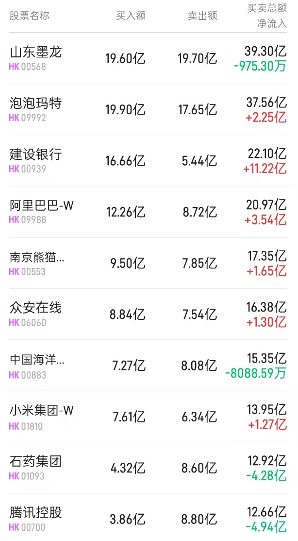 北水净买入最多的个股是建设银行(00939)、阿里巴巴-W(09988)、泡泡玛特(09992)。北水净卖出最多的个股是腾讯(00700)、石药集团(01093)、中海油(00883)。