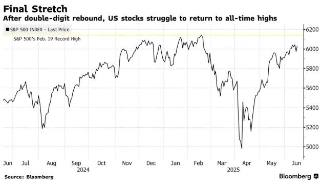 有迹象表明,推动标普500指数自4月低点反弹21%的风险偏好动能正遭遇阻力。该指数近一个月徘徊在6000点关口附近,而股市所谓的"恐慌指数"VIX仍维持在20以下,显示投资者对地缘政治及其他风险的忧虑持续存在。