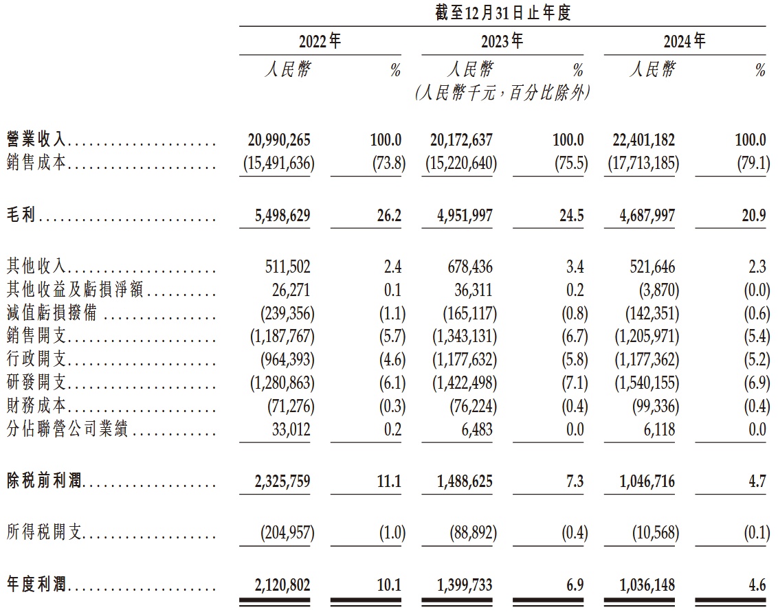 于2022年、2023年及2024年,视源电子实现营业收入分别约为209.90亿元、201.73亿元、224.01亿人民币;同期年度利润分别为21.21亿元、14.0亿元、10.36亿元人民币。