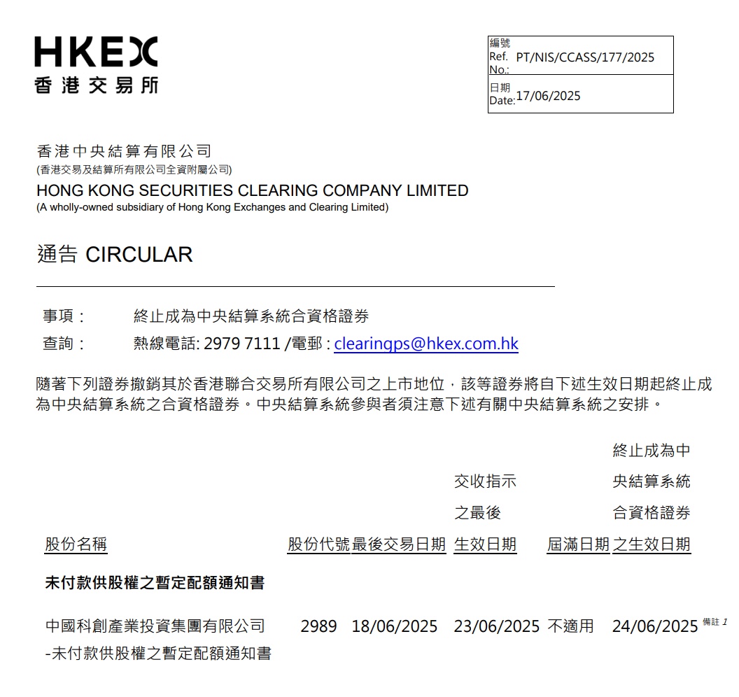 智通财经APP获悉,6月18日,香港中央结算有限公司发布通告,随着中国科创产业投资集团有限公司(02989)撤销其于香港联合交易所有限公司的上市地位,该证券将自2025年6月24日起终止成为中央结算系统之合资格证券。此外,该证券最后交易日期为2025年6月18日,交收指示最后生效日期为2025年6月23日。