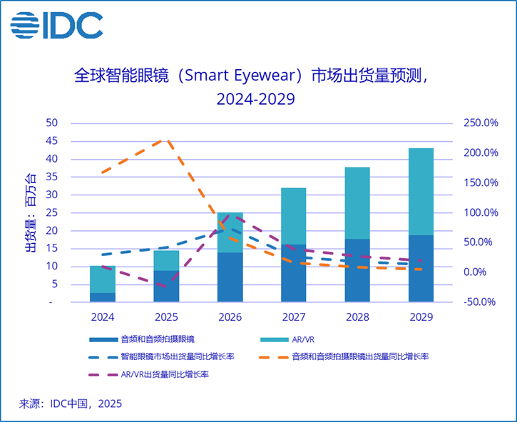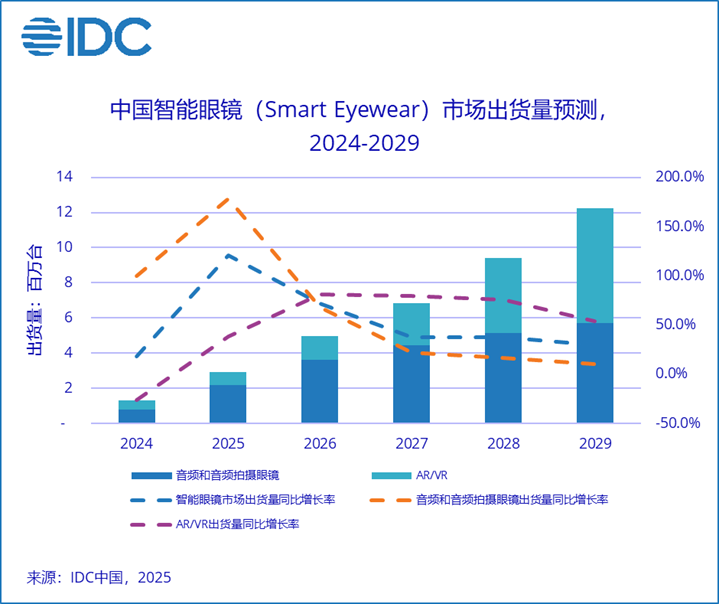 2025年中国智能眼镜(Smart Eyewear)市场出货量预计达到290.7万台,同比增长121.1%,其中音频和音频拍摄眼镜出货量预计216.5万台,同比增长178.4%;AR/VR设备出货量预计74.2万台,同比增长38.1%。