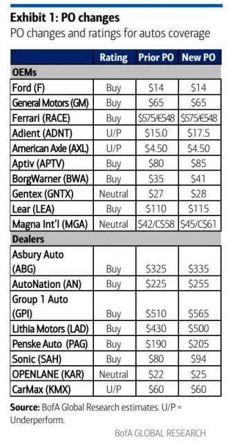 美银根据估算变更及估值,修改了多家厂商和经销商的目标价。其中经销商Lithia Motors(LAD.US)和Group 1 Automotive(GPI.US)等公司的目标价被上调。